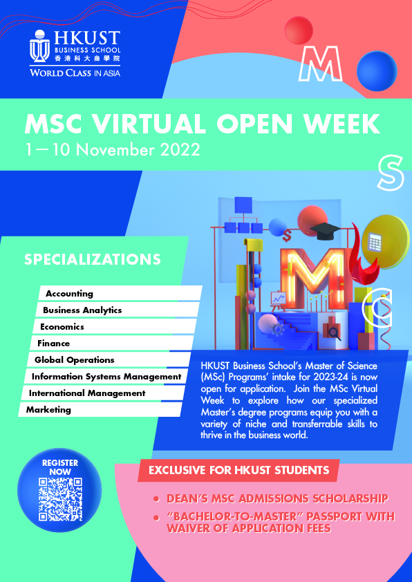 The 2023-24 intake is now open for application. Join the MSc Virtual Open Week to explore how our specialized Master’s degree programs equip you with a variety of niche and transferrable skills to thrive in the business world.